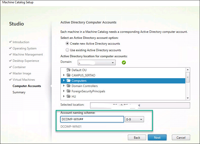Step 22: Select the default AD location and the naming scheme.