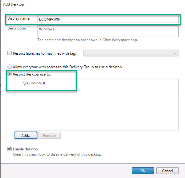 Step 28: On the Desktops click Add… In the Display name and Description fields, type the information to be displayed in Citrix Workspace app