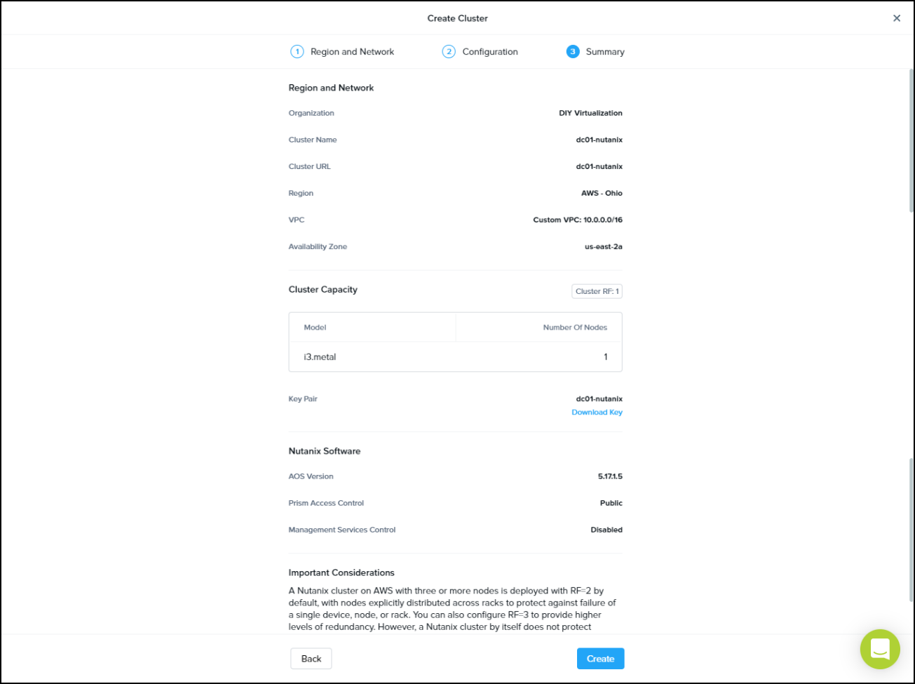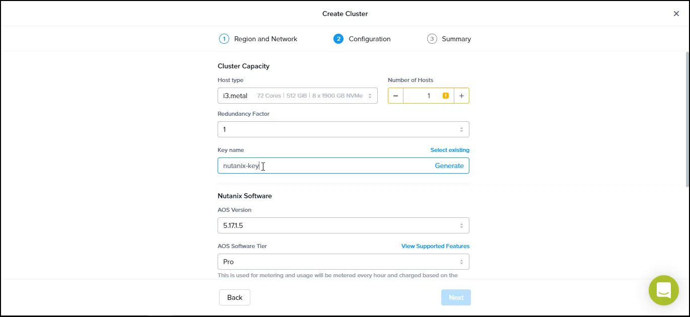AOS versions, cluster capacity, host type, number of nodes, etc. Enter the key name and generate the ssh key, download the generated key. Click “Next”.
