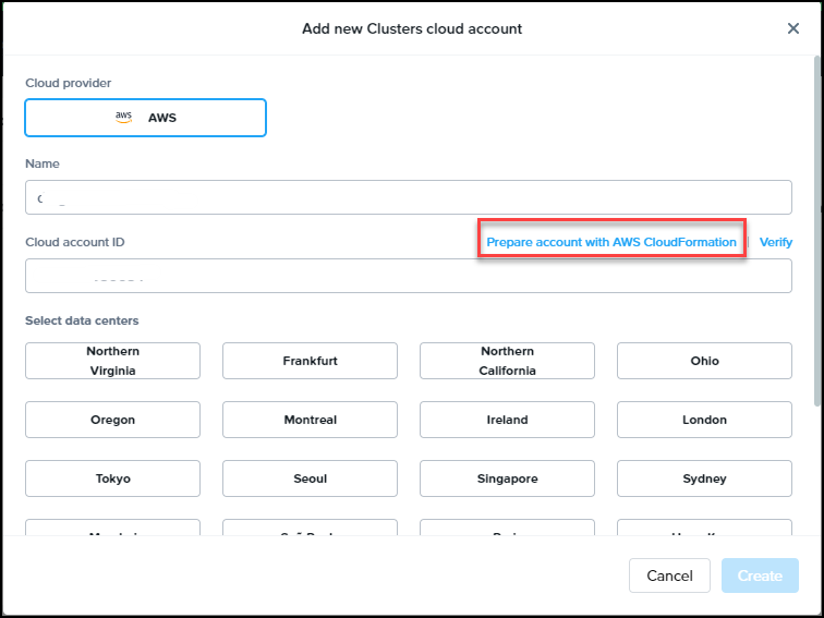Step 4: In Cluster Portal, add your account information and Click on Prepare Account with AWS CloudFormation.