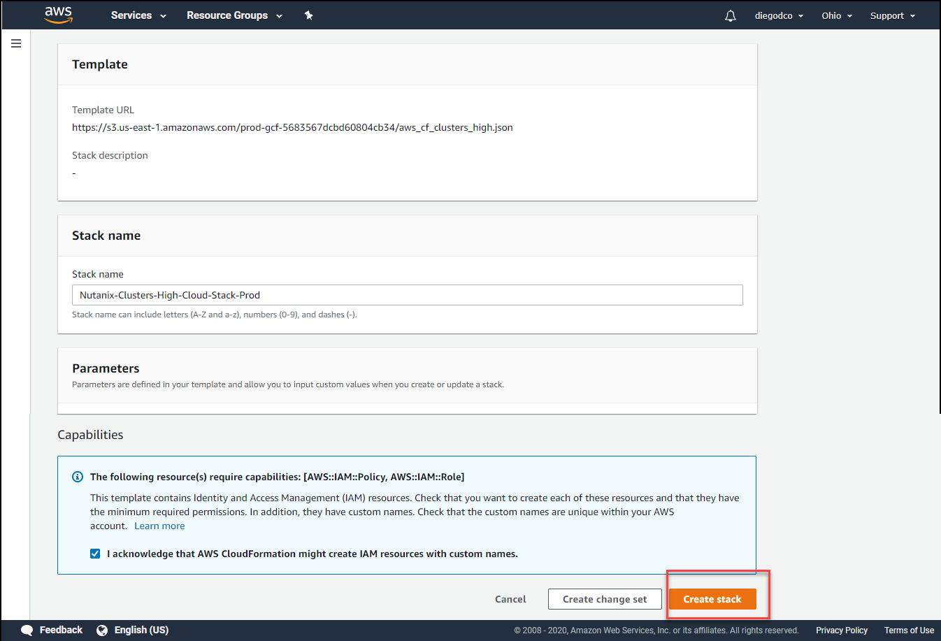 Step 5: You will be redirected to the AWS account, click on Create stack.